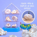 Unearth your inner geologist as you break open ten real geode specimens to reveal beautiful, sparkling crystals inside. Using your own hammer and the included safety goggles, crack open each whole geode to discover the natural treasures within. Then put your gem-tastic collection on exhibit in the beautiful iridescent, crystal-shaped display case. Customize your display case with the colorful decorative stickers.