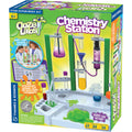 Grab your beakers and test tubes and step up to your special laboratory station for some exciting chemistry experiments. See how much fun chemistry can be as you do slimy, fizzy, colorful, and bubbly experiments. This cool laboratory setup has lots of different vessels and pieces of lab equipment so kids can play the role of chemist while doing real, safe experiments. All of the experiments use non-hazardous chemicals. This playful introduction to the basics of chemistry includes approximately 20 experiments. The experiments are presented on printed cards that can be clipped onto the lab station for easy reference. Experiments include glowing slime, color-changing slime, fizzing reactions, oozing bubbles, rainbow in a test tube, chromatography, cabbage juice pH tests, solutions, filtering, crystals, fire extinguisher, and underwater volcano. The kit includes a large plastic chemistry station, experiment cards, various vessels in different sizes, syringe, measuring cup, pipette, spatula, tube, petri dish, funnel, non-hazardous chemicals for the experiments, and experiment manual.