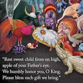 With glittering poetry and stunning watercolor artwork, Lullaby for the King ushers readers into the awe and wonder of the Christmas story. Animals from across the ancient Palestinian landscape lumber, gambol, crawl, fly, and parade toward Bethlehem with gifts worthy of the newborn King. Rare ebony wood, a finely tuned harp, mustard and saffron, a zither, apricot cakes, and other treasures are carried to the manger. The animals bow low and join the music of the angels in a welcoming lullaby.